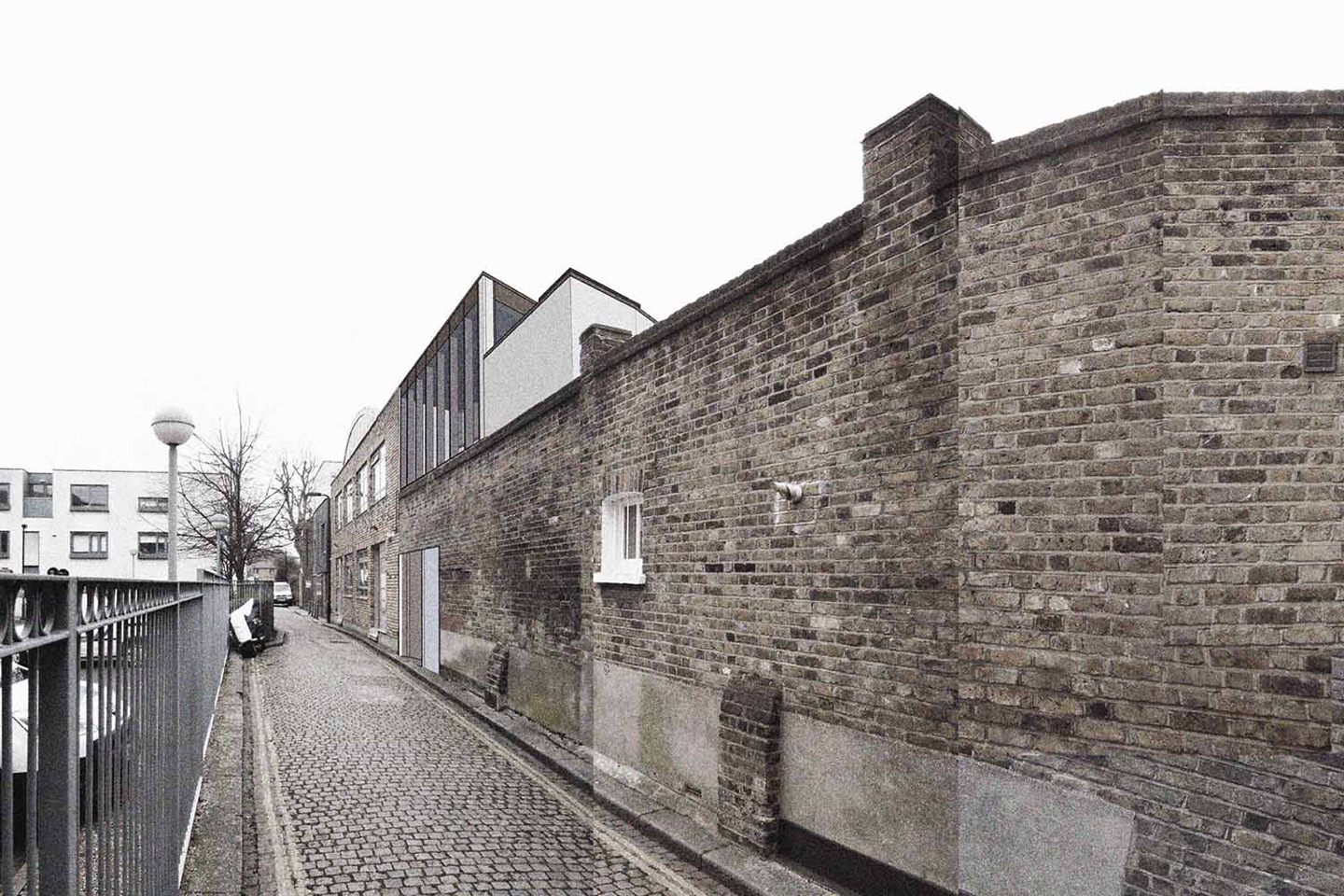 A residential development in a former workshop site that now forms an off street parking for an end of terrace house. The site is both tight and has planning restrictions particularly regarding the new building overlooking the rear of houses nearby. The house sits behind an existing wall that bounds the site from the road with the first floor rising above as a glass lantern. The plan situates the house around a small south facing courtyard that brings light into the depth of the house as well as providing an outdoor space. The house looks inward onto the courtyard at ground floor to limit views to houses nearby while at first floor it looks over the wall to the north.
