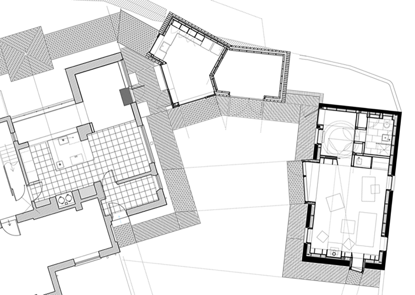 A conversion of an existing barn opposite the main house to provide a study; the erection of a new "barn" along the boundary to provide ancillary space for the house; the hard landscaping of the courtyard formed between the house and the barns; and landscaping of the main garden consolidating the hillside site into terraces to define specific garden spaces . The study conversion was conceived as a building within a building. A timber structure built within the existing brick shell provides depth for insulation and services, and is lined out in cherry panels. This structure projects from two existing openings in the shell to create window bays that provide spaces for sitting. The plan explored the notion of thresholds with an entrance lobby followed by a formed timber opening to the main room staging passage from outside to in. The end walls of the main space provide shelving and storage space, leaving the centre of the room free. The building is heated by a wood-burning stove, while a combination of cross ventilation and dispelling warm air through high-level rooflights keeps it cool in the summer.