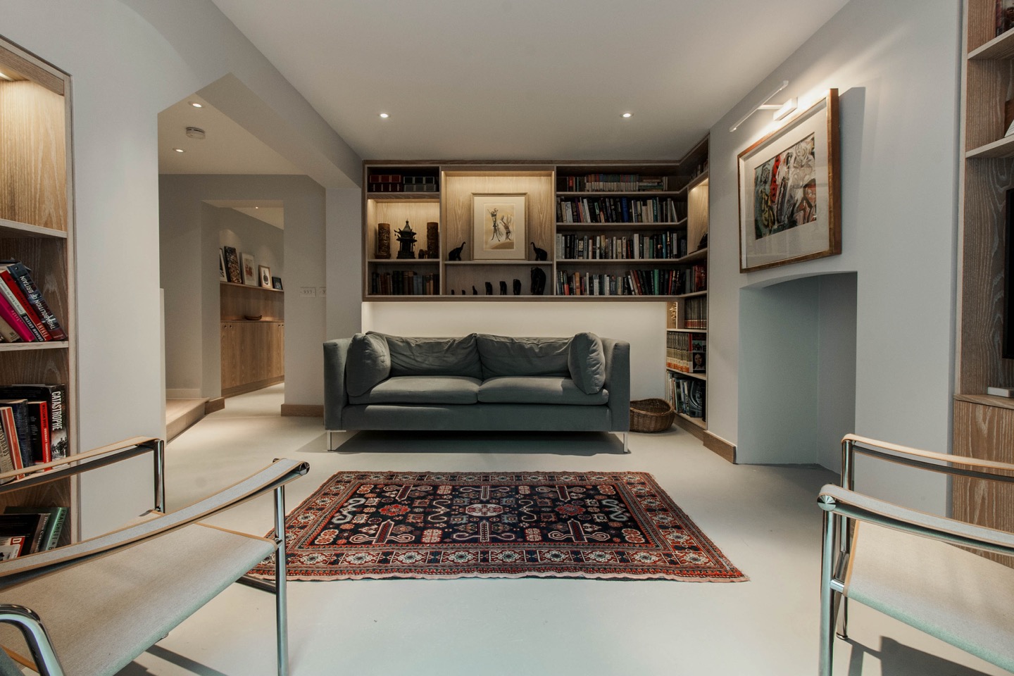 Reconfiguration and extension within the basement of a grade II* listed house in Lonsdale square . Prior to works the living room was situated the front with the bedroom in the rear facing a light well. The proposals reversed the layout placing the bedroom to the front with the main living room to the rear to allow for a connection to the garden. The rear light well was extended to the limit of a ground floor garden wing and enclosed with a glass roof. The rear of the house is oriented north/east meaning there is predominantly ambient light. Rather than creating an intermediary space to negotiate the level change between basement and garden, the extension was conceived as a complete room with four walls which retains its own integrity. The cruciform roof structure reflects this, drawing the focus to the centre of the room. From the outside the glazed envelope runs seamlessly into ventilation panels with automated louvres disguised behind. From above, the extension was detailed to read as a simple glass insertion into the brick surroundings of the existing terrace. Internally, joinery was used to regularise the spaces, filling niches and containing services so as to maintain a less cluttered occupied space.