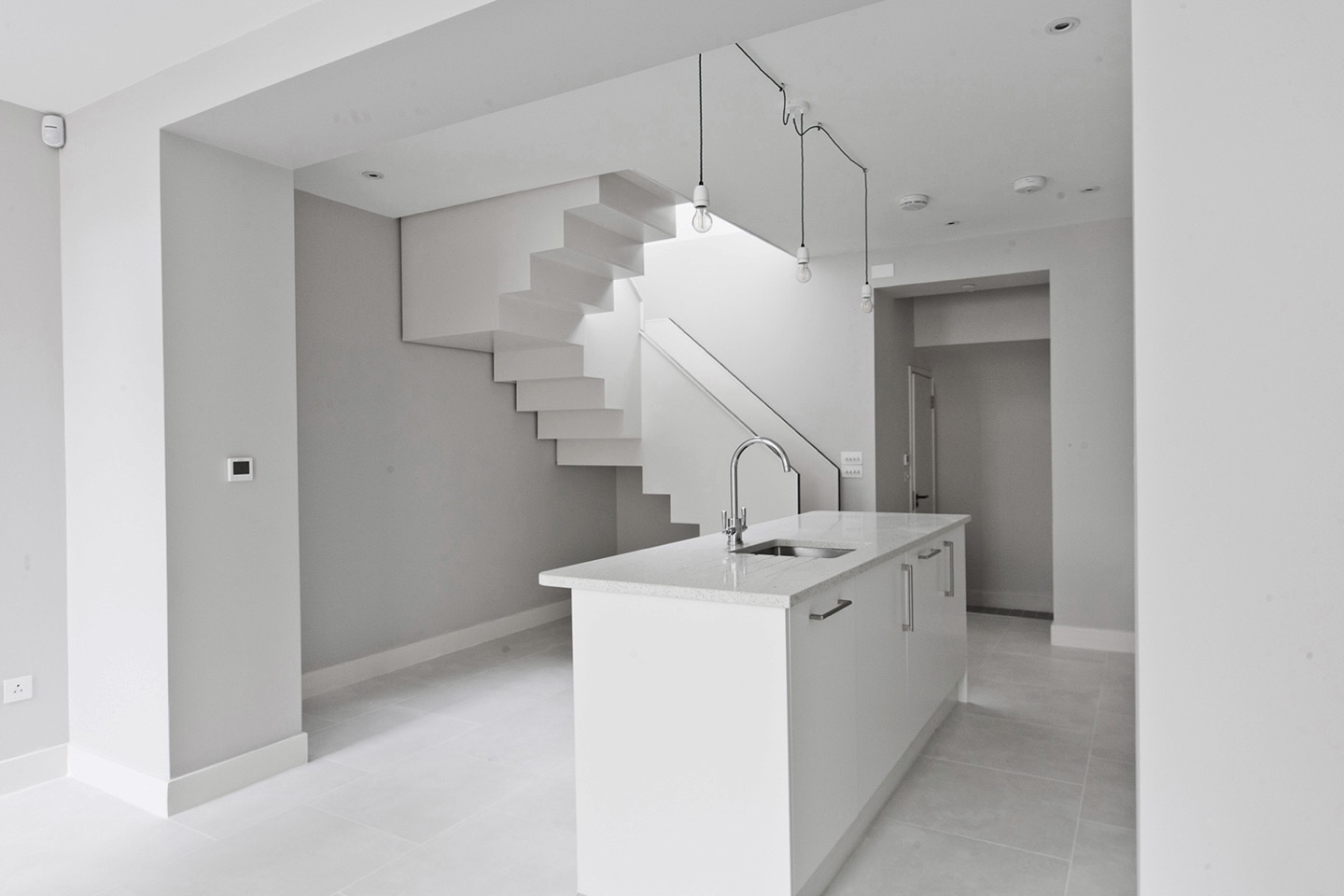 A conversion of a Grade II listed shop into a residence. The basement beneath the shop was dropped to provide living space which opens to a south facing sunken garden to the rear, while at ground floor what was the shop is converted to the bedroom and bathroom. The stairs down to the basement are situated at the front of the plan beneath one of the shop windows to bring light down to the deep plan of the basement. The stair was pre cut by CNC and assembled on site.